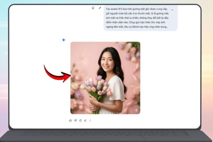 Sau khi tải ảnh, bạn bắt đầu nhập prompt mô tả phong cách mong muốn. Hãy viết rõ không khí 8/3 với hoa, nền pastel hoặc ánh sáng dịu nhẹ. Bạn cũng có thể thêm chi tiết về trang phục như váy trắng, áo dài hoặc phong cách hiện đại. Nếu muốn làm avatar mạng xã hội, đừng quên yêu cầu tỷ lệ 1:1 để ảnh hiển thị đẹp nhất.