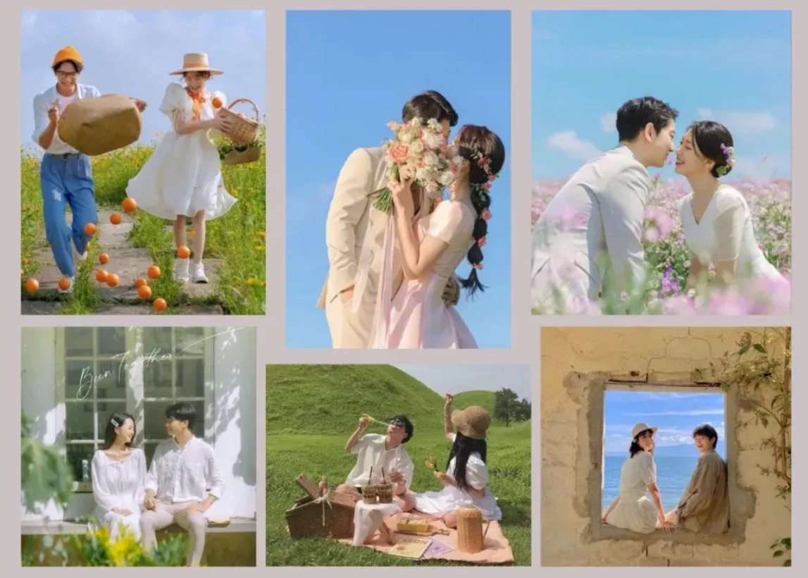 Ví dụ, một chiếc váy trắng hoặc be nhạt của cô gái kết hợp cùng bộ suit xanh pastel của chàng trai sẽ tạo nên một tổng thể vừa tinh khôi vừa hiện đại. Khi đặt trong bối cảnh biển hoặc cánh đồng cỏ, gam màu ấy hòa quyện cùng thiên nhiên, tạo nên những bức ảnh nhẹ nhàng như một khung phim tình cảm Hàn Quốc.