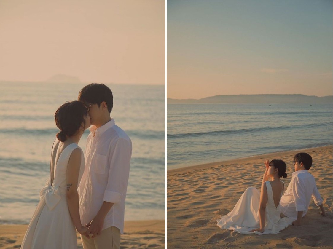 Khi sóng vỗ nhẹ vào bờ, gió biển khẽ thổi tung làn tóc, đó chính là khoảnh khắc lý tưởng để ghi lại những bức hình tràn đầy cảm xúc. Các cặp đôi thường chọn chụp vào thời điểm bình minh hoặc hoàng hôn, khi ánh sáng tự nhiên dịu dàng nhất. Ánh nắng vàng xen lẫn màu cam ấm áp không chỉ làm nổi bật làn da mà còn khiến trang phục pastel trở nên lung linh và hài hòa.