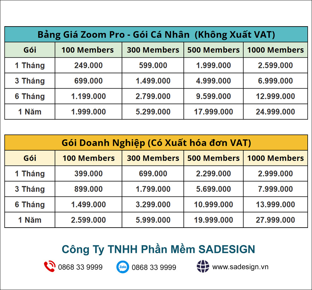 Sadesign còn cung cấp các gói Zoom Pro với sức chứa linh hoạt, đáp ứng mọi nhu cầu hội họp trực tuyến, từ 100, 300, 500 người đến tối đa 1000 người tham gia.
